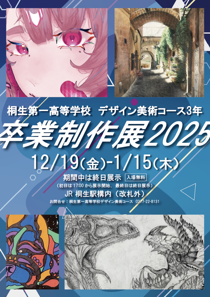 デザイン美術コースより、卒業制作展の案内です。 先週12/13(金)より、桐生駅にて「デザイン美術コース3年 卒業制作展」が開催されています。 【期 間】12...
