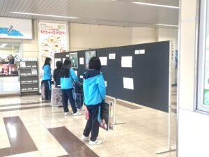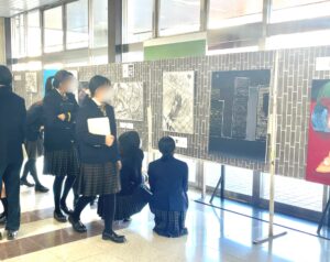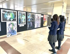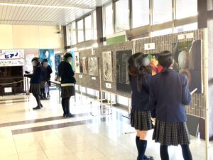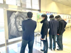 また、期間中は授業の一環として2年生も桐生駅を訪れ、先輩たちの作品鑑賞を行いました。2年生の皆さんは、今回3年生から学んだ「表現力」や「技法」を参考に、ぜひ今後の制作活動に生かしてください。